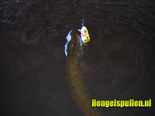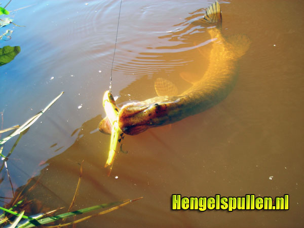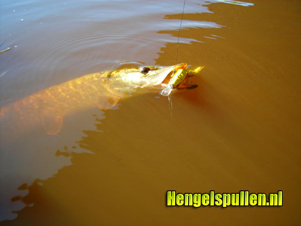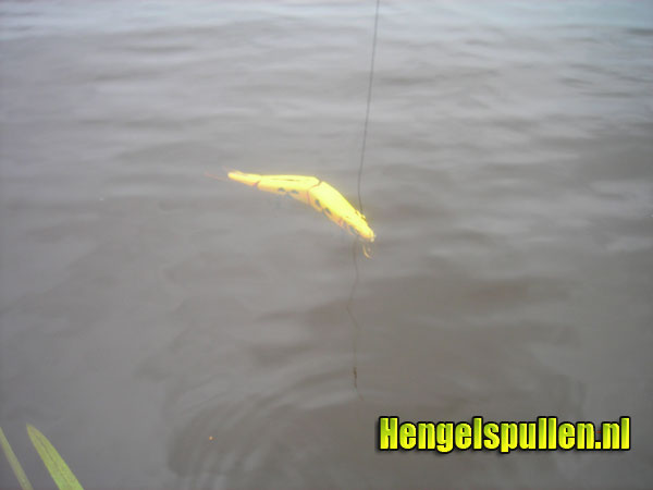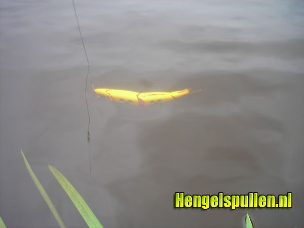 Het zal mijn oude leerkrachten verbazen, maar ik denk dus na, als ik ga vissen. Welke hengel ik mee neem bijvoorbeeld en welke aasjes ik in combinatie gebruik, logisch toch? Ik besloot de Isotope, h', wat een schijtnaam, ik hou het bij Tsjernobyl, te vissen aan een baitcaster (30-90 gram), een plat ABU reeltje en een 15 kilolijntje van Powerpro, dat ging perfect, bellissimo!, zowel vanaf de kant, als vanuit de boot. Als een gele slang glijdt deze voor radioactieve straling waarschuwende plug door het water. Dit aasje duikt achter de schuit tot ongeveer een meter diep, maar de charme ligt toch in het binnenhalen in korte rukjes. De Tsjernobyl krijgt dan een volstrekt onvoorspelbare actie, zweeft, schiet uit naar links, rechts, boven, beneden en nodigt daarmee uit tot een aanbeet, want dit 'zieke' visje is een buitenkansje dat geen weldenkende snoek voorbij laat schieten. De watergang van dit aasje is te zien via rixhengelsport.nl of de site van de producent www.prologicfishing.com. Het duurde niet erg lang voor de eerste krassen op het nepvisje zaten. Alle waarschuwingen ten spijt, 'brother en sister pike' gingen over tot de aanval, tot mijn grote verbazing zelfs in kraakhelder water, waar ik dit knalgele aasje toch minder geschikt voor achtte ' zou de theorie dat meer de actie, dan de kleur invloed heeft op het bijtgedrag van de snoek meer waterdicht zijn dan ik vermoedde?