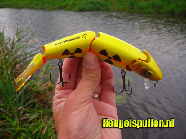 We kennen allemaal het begrip writersbloq, een minder bekende variant is designersbloq, de ontwerper zit met klam voorhoofd naar een leeg beeldscherm te turen, dat leuke, verfrissende patroontje wil maar niet vallen, geen inspiratie, de wanhoop en frustratie leidt tot ruzie met zijn lief, die naar haar vriendin vlucht om uit te huilen en de hond, waartegen ie net achter uit de keel is loos gegaan, kruipt diep weg in de mand, de oren plat op het hoofd. De schrijver grijpt naar de fles, gooit z'n poten op tafel, richt de afstandsbediening op de dwangbuis, zapt om af te reageren langs vele kanalen, maar blijft hangen bij een reportage over Tsjernobyl. Op 26 april 1986 sprong daar een kernreactor en de wijde omgeving moest worden ge'vacueerd. Tsjernobyl, een plaats van 15.000 inwoners werd een door alles en iedereen verlaten spookstad. Tot op de dag van vandaag hangen her en der gele waarschuwingsborden met een zwarte', ja wat is het, laten we zeggen proppeller. De ontwerper is op slag nuchter en krijgt de geest, 'eureka, dat is 'm, dit wordt mijn nieuwe motief, als een gek gaat ie aan de slag en even later is de variant Isotope geboren', jammer dat niet iets meer fantasie is gebruikt bij de naamstelling, die is drie keer niets, maar goed, dat is bijzaak. Je hebt van die aasjes waar je direct vertrouwen in hebt. Mijn inschatting was: vier losse segmenten, alle donders, dit is qua actie vast een nog sensueler fantoompje dan de J13. Voor de tewaterlating gaf ik haar een kus en sprak ook plechtig: 'ik doop u de Tsjernobyl, en wens u een prettige en voorspoedige ontmaagding!' Daarover straks meer, eerst de koele cijfers. Deze 19 cm lange vierdelige plug is 52 gram zwaar. De 'gele onderzee'r' is suspending, met andere woorden zweeft in het water, wanneer met inhalen wordt gestopt en de inpandige loodhageltjes hebben als diepere bedoeling dat zelfs de meest suffe snoek alert wordt van het getingeltangel.