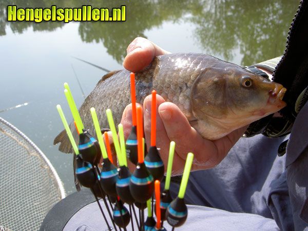 Wat mij opviel waren de soms heel subtiele aanbeetjes. Vooral de oudere karpers waren een stuk voorzichtiger geworden. Was het vorig jaar nog zo, dat de lijn vanzelf strak liep, was de karper nu een stuk voorzichtiger. Vooral hier hebben de lichtste exemplaren (0,15 gram) van de 'Carp'en de 'Carp Inline'zich bewezen. Keer op keer was ik de karper te slim af. Vanwege de minimale weerstand van deze dobbertjes was het regelmatig raak. Ondanks het feit dat ik met een eerste klas (16/00) hoofdlijn viste, met daaraan een (14/00) fluorocarbon onderlijn (als een soort breeklijn), verspeelde ik een van mijn tuigen. Niettegenstaande het feit dat ik nog een paar identieke dobbertjes had, had ik buikpijn. Tjonge, wat vissen deze dobbertjes fijn. Zowel de 'Carp'als ook de 'Carp Inline'hadden na een dagje Vossekuil niets geleden. Na dik vijfenveertig karpers gingen deze tuigen na een dagje intensief vissen dan ook weer als nieuw terug mijn tuigenla in.