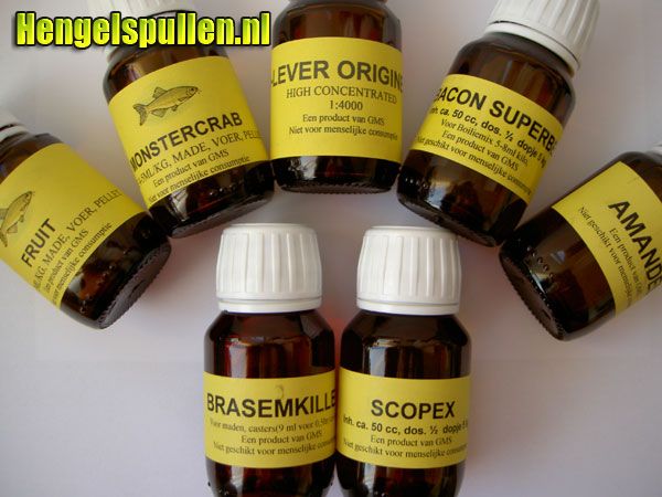 De overige GMS 50 ml aromaten zoals Botercocos, tropic, tutti frutti, kers, squid en banaan, zijn stuk voor stuk goed. Ze zijn net als de hierboven genoemde geur-/smaakstoffen zuiver, geconcentreerd en een eerste klas product. Alleen zijn bepaalde aromaten (zoals lever) blijvers en andere net als mode gevoelige artikelen; vandaag hot en morgen verguisd en vergeten. Nou ja''''vergeten, gezien de vangstresultaten zoals gerealiseerd door karpervissers, met boilies geflavourd met aromaten uit deze laatste groep, zijn ook dit killers. Ook zij zijn niet meer weg te denken uit het assortiment van Piet Groot. Dat GMS vis zichtbaar maakt, geldt zeer zeker ook voor deze laatste groep aromaten.