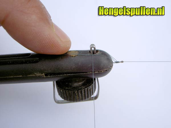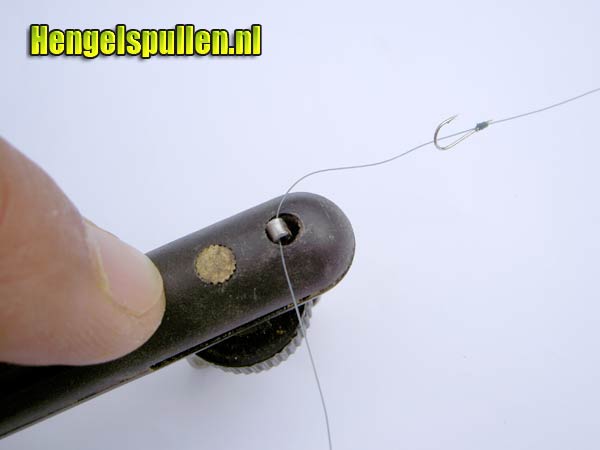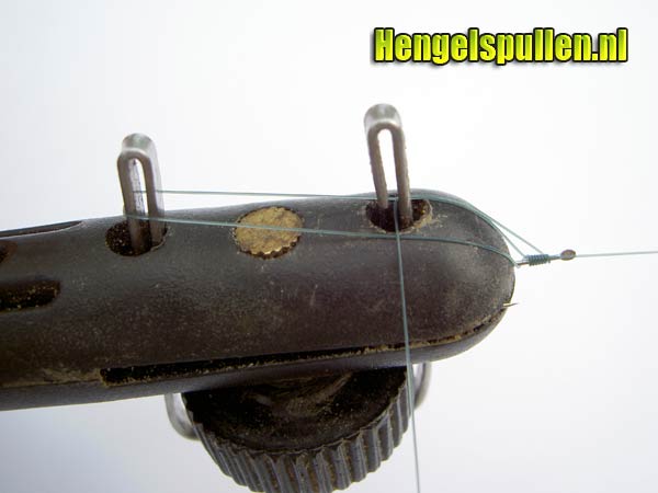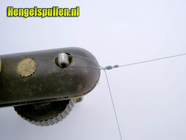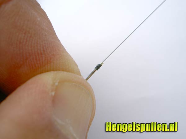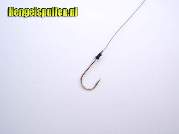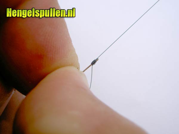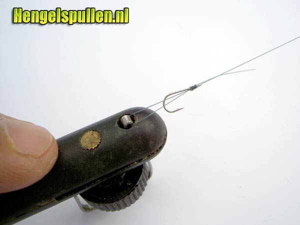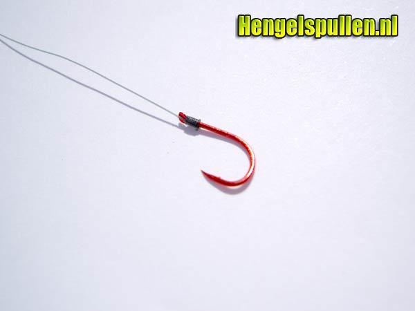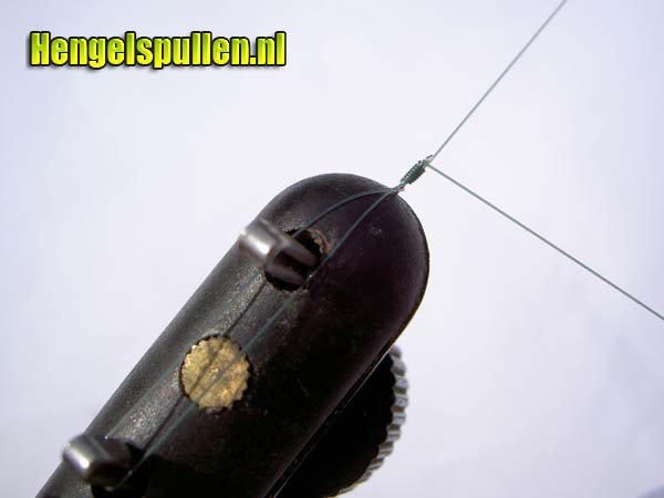 7) Let op! Dat de lijn netjes om de steel van de haak wordt gedraaid, de nylonwindingen dienen tegen elkaar aan te liggen (zonder al te veel tussenruimte en ook niet over elkaar)!