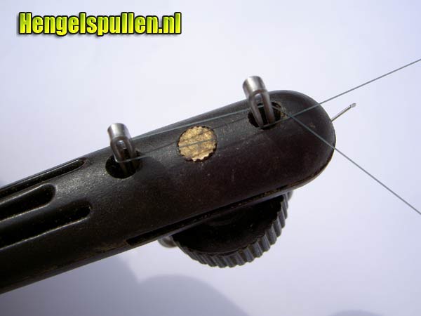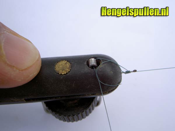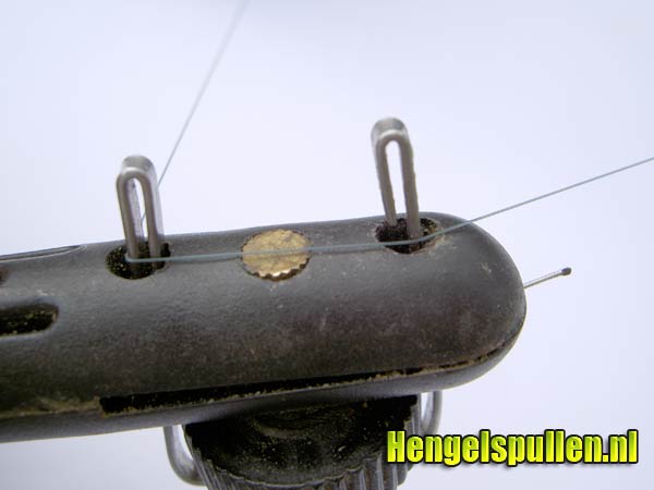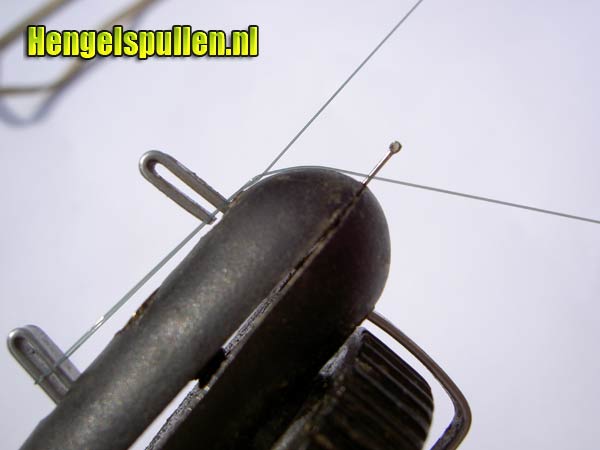 9) Na haki-an 7 ' 8 om zijn as te hebben gedraaid, voer je de nylon draad over de steel van de haak, langs de voorzijde van het eerste ijzeren clipje (gerekend vanaf de haak), direct links om achter deze clip terug (wanneer deze clip maximaal omhoog geduwd is, valt de draad precies tussen de twee ijzeren pinnetjes van deze clip). Lep op! Blijf constant lichte druk op de nylon draad uitoefenen.