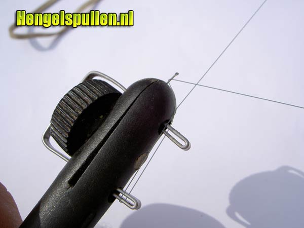 2) Houd haki-an in uw linkerhand en de lijn met uw rechterhand vast. Hierbij dienen de twee ijzeren clipjes (van haki-an) naar boven gericht te zijn. (handig om op de klos nylon iets zwaars te leggen of deze tussen je knie'n te klemmen, waardoor er lichte spanning op de draad kan worden gezet.)