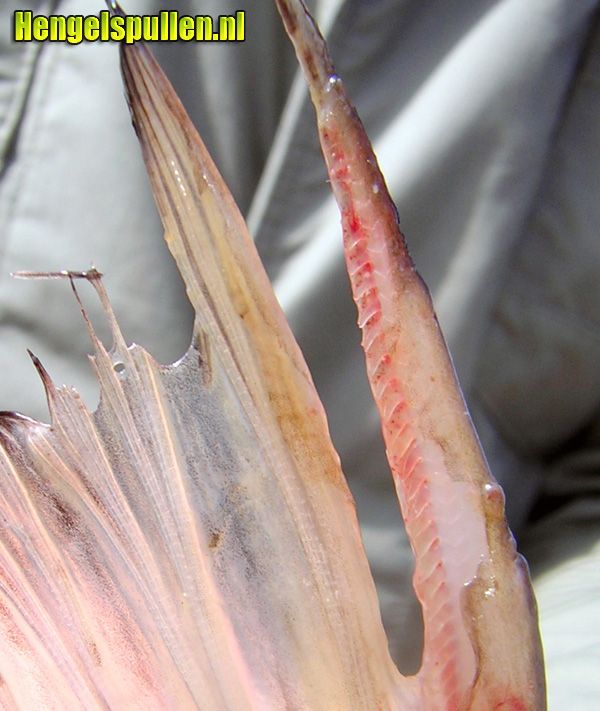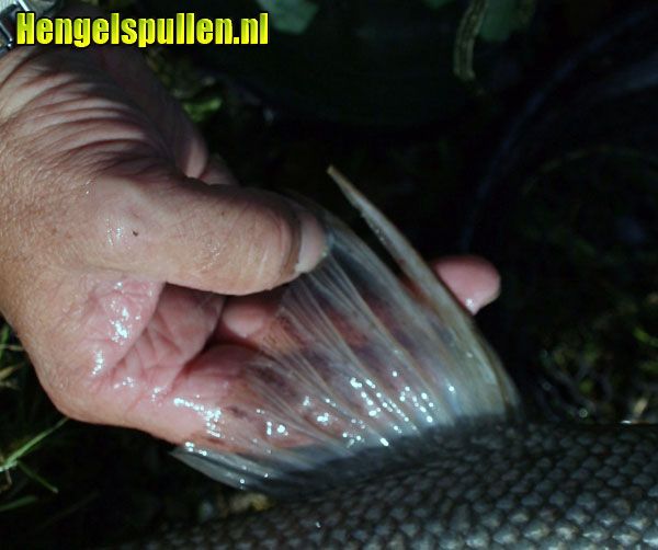 Mijn pannet was vervaardigd van nylon, en is redelijk fijnmazig. In mijn ogen ideaal'.totdat'ik een keer een barbeel terugzette en deze niet uit het schepnet wilde komen, ondanks krachtige pogingen van de vis. Het bleek dat de barbeel met zijn eerste harde rugvin in een maas van het schepnet terecht was gekomen. Alsof het dun vloeipapier was, scheurde daarna de vin in een mum van tijd helemaal in. Ik schrok hier behoorlijk van ! Op zo'n zwakke plek had ik niet gerekend. De gehele gescheurde vin bevatte allemaal kleine tandjes, wat het zeer moeilijk maakte om de vin los te krijgen uit de mazen van mijn schepnet. Om dit toch snel te kunnen doen, knipte ik het nylon rondom kapot. Ogenschijnlijk had de barbeel niets geleden, met een ferme duik naar de diepte verdween hij uit mijn gezichtsveld. Het gebeurde me dat jaar nog 1x, al was deze vin al in een eerder stadium gescheurd. Ik zag de beschadiging al meteen tijdens het drillen. Meteen na het scheppen spiesde de vin zich vast in de mazen. Deze keer zat hij echt diep vast! Ik knipte meteen alles weg bij de vin en zette de barbeel meteen terug.