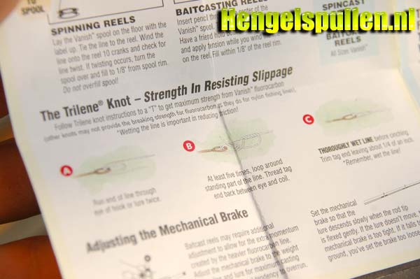 In de gebruiksaanwijzing staat onder andere hoe je de lijn op moet spoelen en hoe je een Trilene knoop maakt