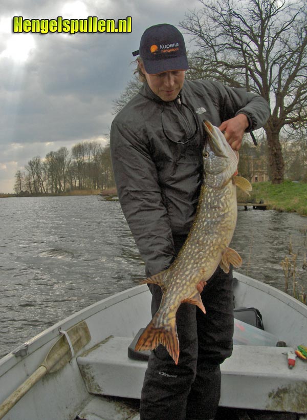 "Als er een snoek ligt, zou hij die plug van mij moeten pakken!" redeneerde ik tegen Arjan. Arjan zweeg. Aan de ene hengel had ik een dieplopende Ernie, aan de andere het wonderaas van Bob. En BOEM, op een gegeven moment voelde ik vis. Een gevecht begon, wat door de twee hengels in mijn hand meer leek op een nieuwe vorm van mikado dan op het 'vangen van snoek'. Ondanks dit schouwspel was er onomstotelijk vis aan de haak. Mijn C.J.W. hengel in combinatie met een Daiwa Bayard reel en nieuwe rode Power Pro lijn (18.00mm) van Kuperus, ving netjes alle klappen op. Een mooie meter kwam naar de boot toe gedreven en na wat gespartel kon de dame geland worden. Vol adrenaline en vreugde onthaakte ik de snoek in de kieuwgreep. Arjan maakte een paar mooie kiekjes, deed de meting (precies 100cm) en daarop volgend werd de dame terug gezet in haar element. Aan reanimeren had ze geen zin. Mevrouw gaf een fikse klap met de staart en dook terug in het 2.5 meter diepe water. Een stevige handdruk van Arjan en een bijbehorende borrel maakte de vangst compleet. Een instinctief oergevoel maakte zich over mij meester.