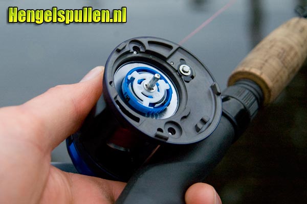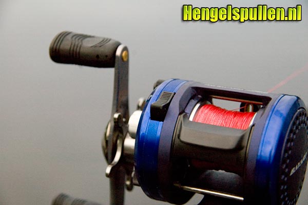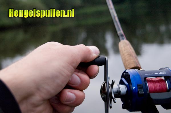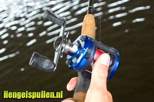 Ik heb hier de vrijloop (de knop onder mijn duim) ingedrukt. Laat ik deze knop los, dan komt de knop naar boven en geeft de reel geen lijn meer.