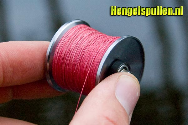 De lijn wordt netjes door de geleider op de spoel gewikkend.