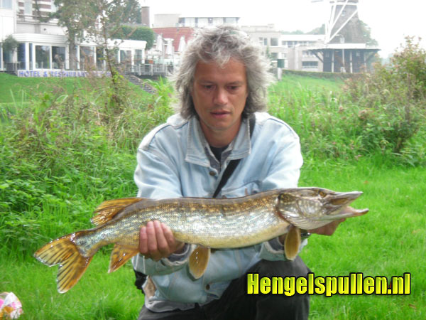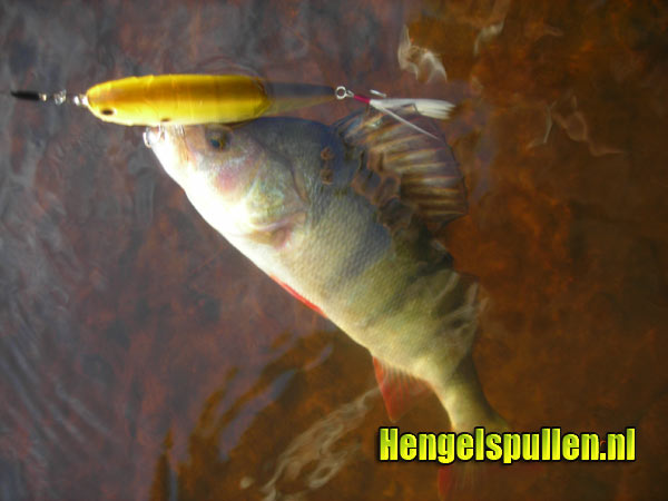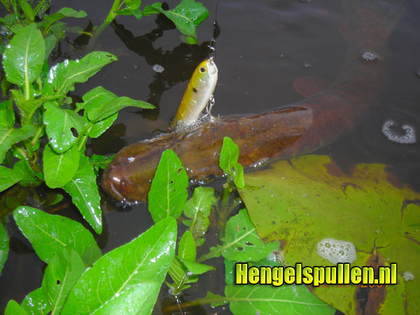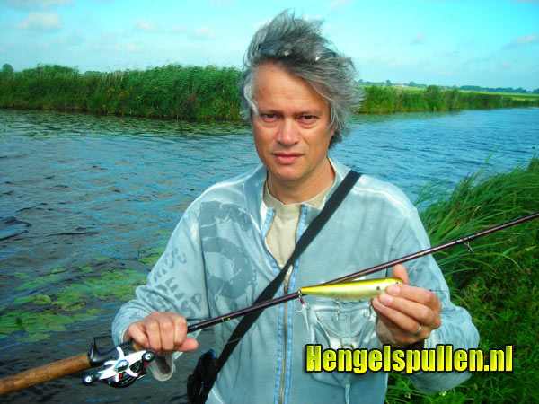Mijn verbeelding slaat dikwijls op hol. Na een paar worpen werd Sammy 128 door mij omgedoopt tot Arie, hetgeen nadere verklaring behoeft. Arie is bij de plaatselijke voetbaltrots terreinknecht, of eh, vergeef, terreinmanager, want tevens 'het geweten' van de vereniging. Na een lange zondag wil het nog wel es wat al te gezellig worden in de kantine. Na twintig biertjes neemt Arie geen blad meer voor de mond en roept spelers en trainers na een vermeende wanvertoning luidkeels ter verantwoording. In de regel moet een bestuurslid hem van achter de vlakke hand in het oor fluisteren dat het 'voor zijn eigen bestwil' verstandiger is te vertrekken. Na het nodige tegensputteren druipt het clubicoon af en fietst onder het slaken van verwensingen huiswaarts. In de verte zie je zijn achterlicht slingeren over de weg die hij over de gehele breedte nodig heeft. Het kabaal en de actie van Sammy 128 kan de vergelijking met de beschonken terreinmanager goed aan, sterker nog, tel er maar bij op dat de Sammy tevens een slag in zijn voorwiel heeft van hier tot Tokio. Dat de Sammy direct een bijnaam krijgt zegt alles, dat doe ik alleen met aasjes die me dierbaar zijn. De blauwe J13 van Rapala bijvoorbeeld heet 'de blauwe engel' en de witte x-rap van hetzelfde merk 'de heilige geest'. De Arie of Sammy heb ik getest aan een baitcaster van Arca/Bifa (20-40 gram) en de Element 5500-reel van Rozemeijer. Arie reageert zelfs op het kleinste, luizigste tikje van de hengel en trekt ongecontroleerde sporen in het wateroppervlak en plopt en ratelt naar hartelust. Het duurde dan ook niet lang of ik had de eerste aanbeet, of eigenlijk aanslag, zo kiezelhard knalde het snoekje van 72 centimeter op het goudkleurige nepaasje. Ik vermoed dat de combi van een lawaai, schittering en de onvoorspelbare gang de adrenaline in een snoekenlijf doet kolken, anders kan ik de overrompelende 'blitz' aanvallen niet verklaren. Ook 'de Daltons' van het zoete water, het gestreepte baarsgeteisem wordt er helemaal crazy van, het is echt 'kill en attack'.