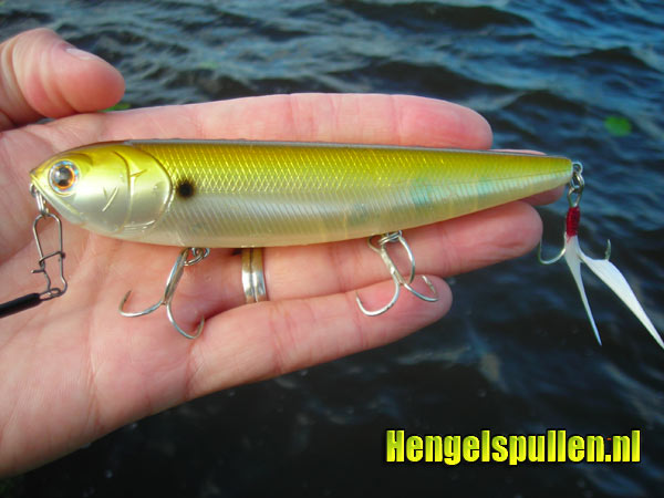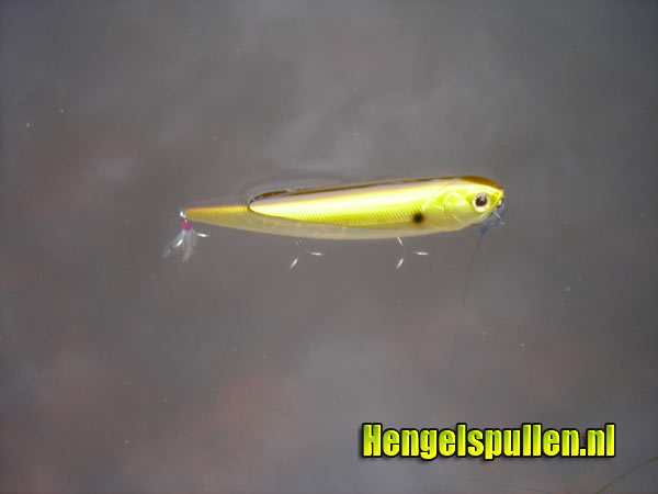 Eerst even wat zakelijke gegevens. Een zoektocht op Google leert dat de Sammy 128 een zogeheten topwaterbait is, met een 'walking the dog' actie, een goed gevonden vergelijk, want speelse en nieuwsgierige hondjes dribbelen graag zigzag van struik naar boompje en van boompje naar struik. Een schaatsenrijderactie op het rechte stuk zou je ook kunnen stellen. De Sammy 128 is in zoverre uniek dat ie deze beweging combineert met het gespetter van een popper en als overtreffende trap ingebouwde stalen kogeltjes heeft ie bij ieder tikje van de hengelaar ratelen. De door mij uitverkoren variant 'golden shiner' doet zijn naam alle eer aan, blinkt als goud, werpt als een speer en is voorzien van drie kiezelharde, scheermesscherpe dreggen, waarvan de achterste opgesierd met een witte pluim. De Sammy 128 weegt 28 gram (1 oz) en is 12.8 centimeter lang.