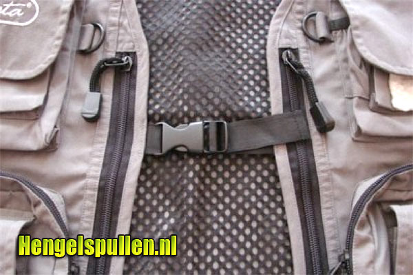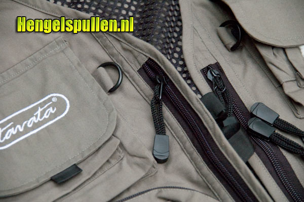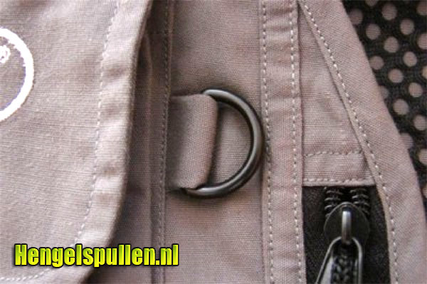 Aan de voorzijde bevinden zich 2 kunstof D ringen waar je een tangetje, schaartje of een knipper aan kunt hangen De ring aan de achterzijde is bij ieder vest standaard. Verder is het vest voorzien van goede ritssluitingen en een kliksluiting aan de voorzijde. De kleinere opbergzakken zijn voorzien van klittenband sluiting. De hengelhouder maakt het vest helemaal af. Hierbij is goed ingespeeld op de wensen van de vliegvisser, zeker als je beide handen vrij wilt hebben tijdens het waden, lopen of het maken van een foto.